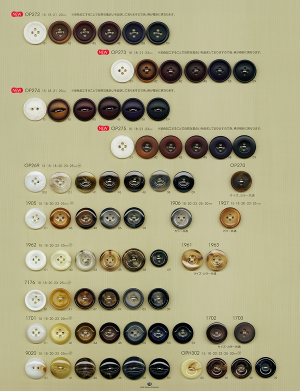 豊かな秋の実りを想像させるような重厚感のあるボタンや、冬の装いに負けないゴージャスなボタンなど、お客様のご希望される商品を以下のカタログよりお探しください。
